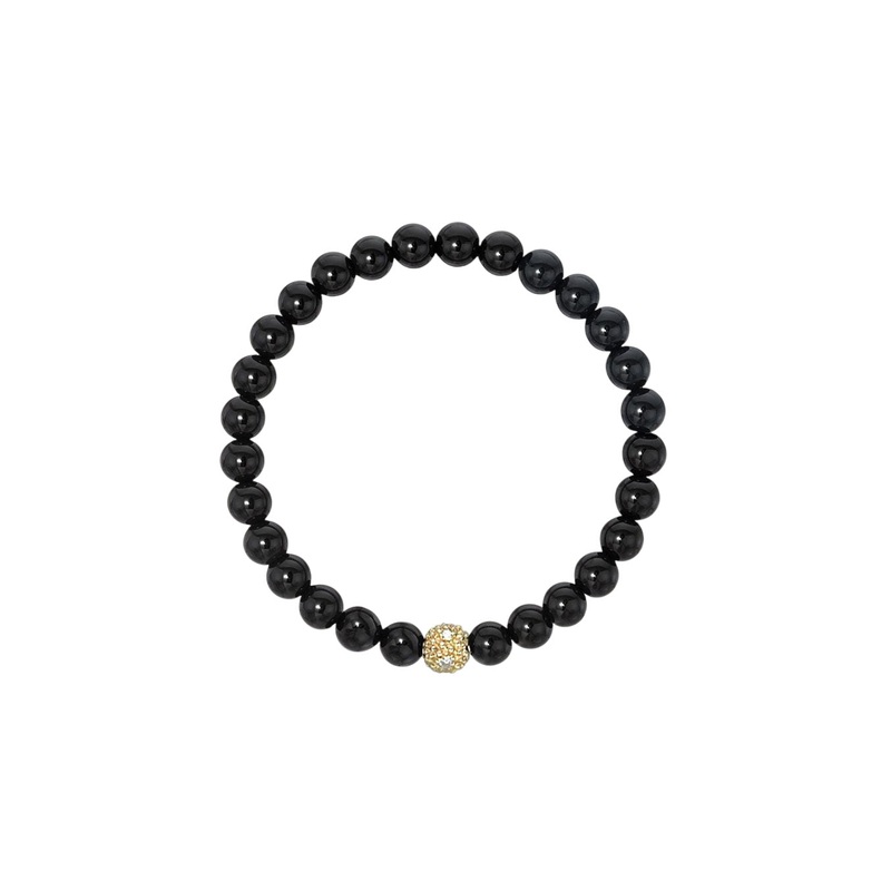 Features a chic 6mm black onyx bead bracelet. Includes a single 14k yellow gold diamond bead. Offers an elastic stretch fit for easy wear. Can be worn alone or stacked with other bracelets. Made in L.A. Comes packaged in a branded protective sleeve.