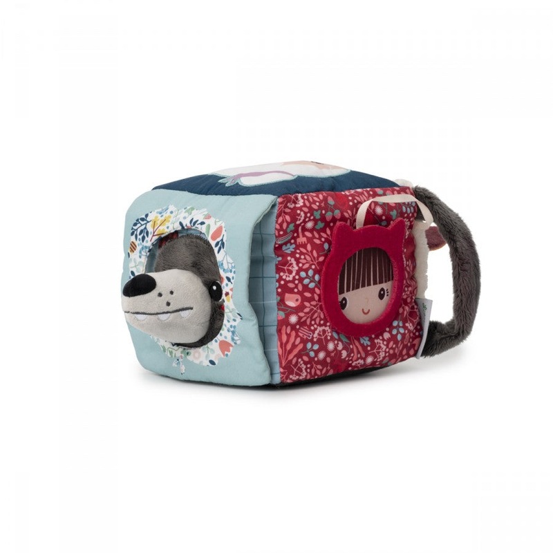 Colourful cube with different sounds, materials, and surprises on each side. Flaps and shapes hide various characters including Grandmother, the wolf, Little Red Riding Hood, and a little pig. Reflective surface allowing for fun interactions. Made from 100