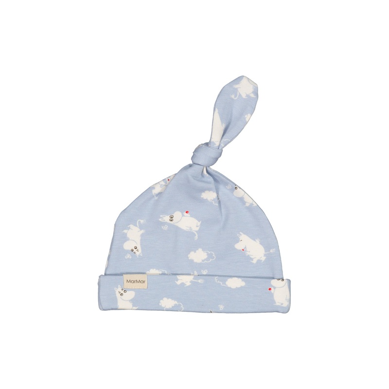 Small hat with Moomin print for newborns with a brim that can be folded down and a cute knot on top. The hat is soft, stretchy and comfortable to wear.