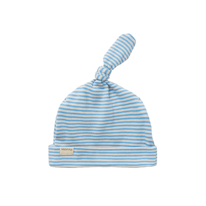 Small striped hat for newborns with a brim that can be folded down and a cute knot on top. The hat is soft, holds its shape and color and has elastane in it, which makes it stretchy and comfortable to wear. Standard 100 by OEKO-TEX certified (OEKO-TEX STAN