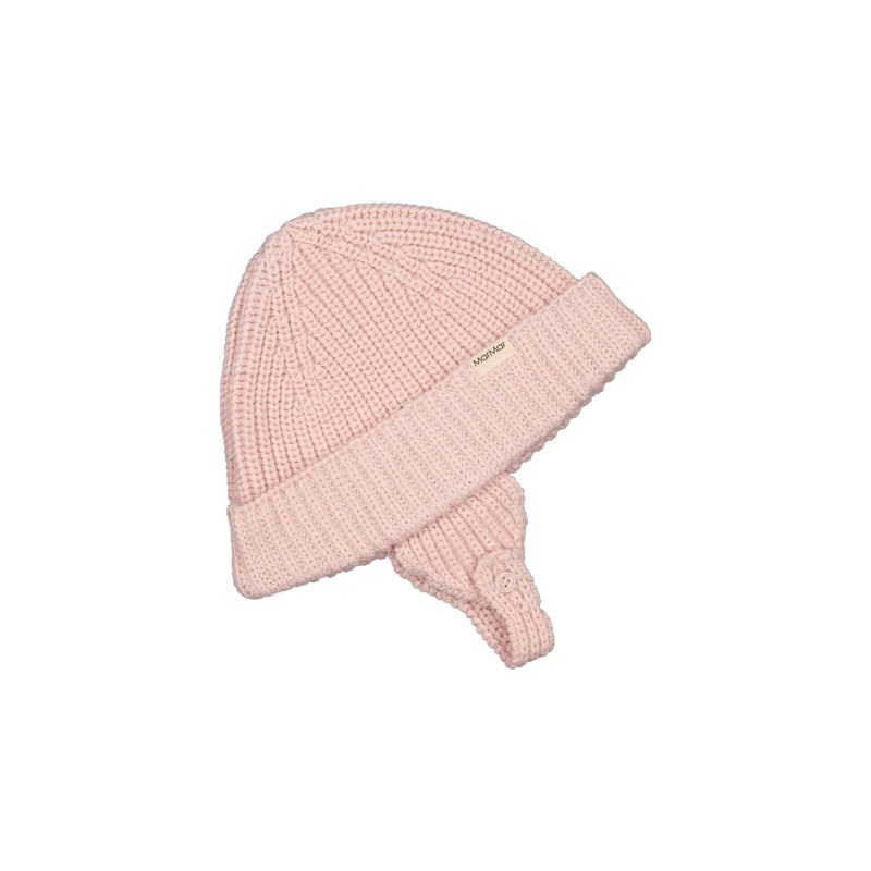 Knitted hat that goes down over the ears with a strap under the chin that can be adjusted with a button closure. The knitted hat is soft, chunky and has a nice drape and is perfect for both spring and autumn.