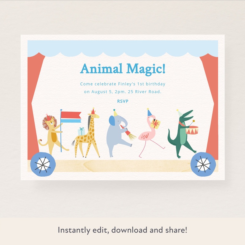 The animals are on parade and they want you to come to a special party! Create your own fabulous party invitations with our digital template. This features our beautifully illustrated, and adorable, animal designs all you need to do is add in the child's n