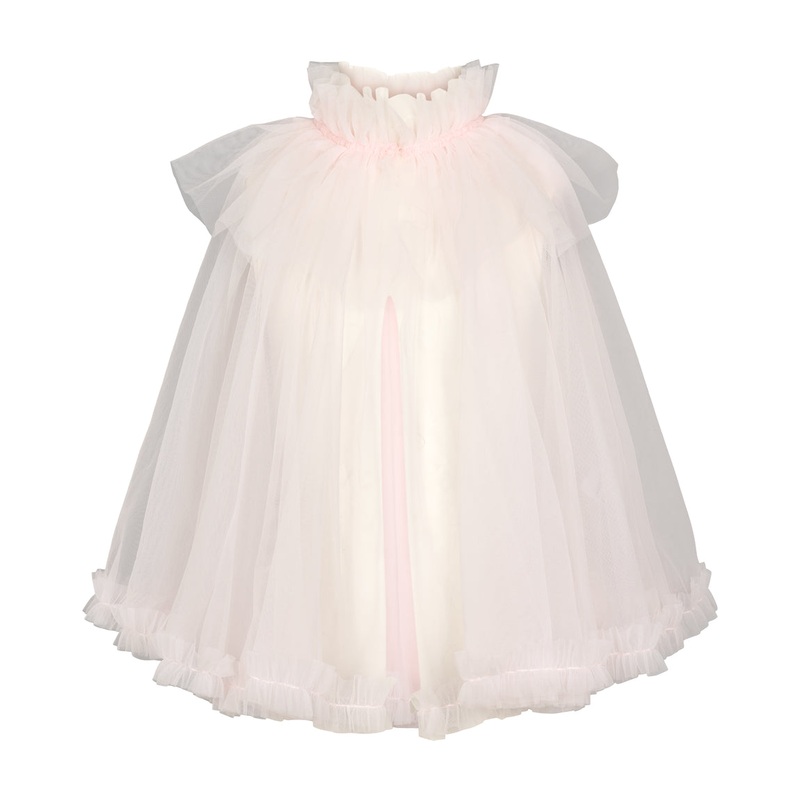 Beautiful and festive cape with many layers of tulle for volume. The cape has a button closure at the front and elastic at the neck for a comfortable fit.