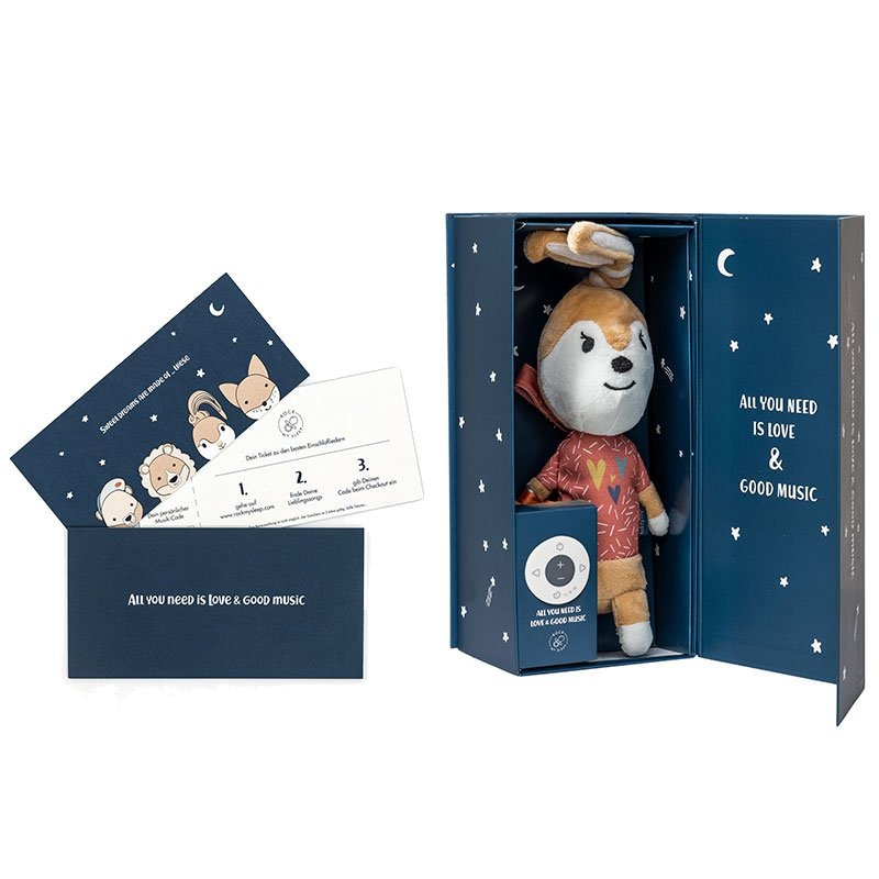 No more Twinkle, Twinkle, Little Star! Rock my Sleep music boxes play full versions of all your favourite songs at the touch of a button. Choose from a variety of cover versions of rock, pop and hip-hop hits and save them on the built-in, removable music player. Tracks can be downloaded from the Rock my Sleep music store and easily transferred to the music box using the enclosed data cable. In addition to the songs offered by Rock my Sleep, you can also upload your own music or audio books for a customised music box and personalised bedtime ritual for the whole family.
