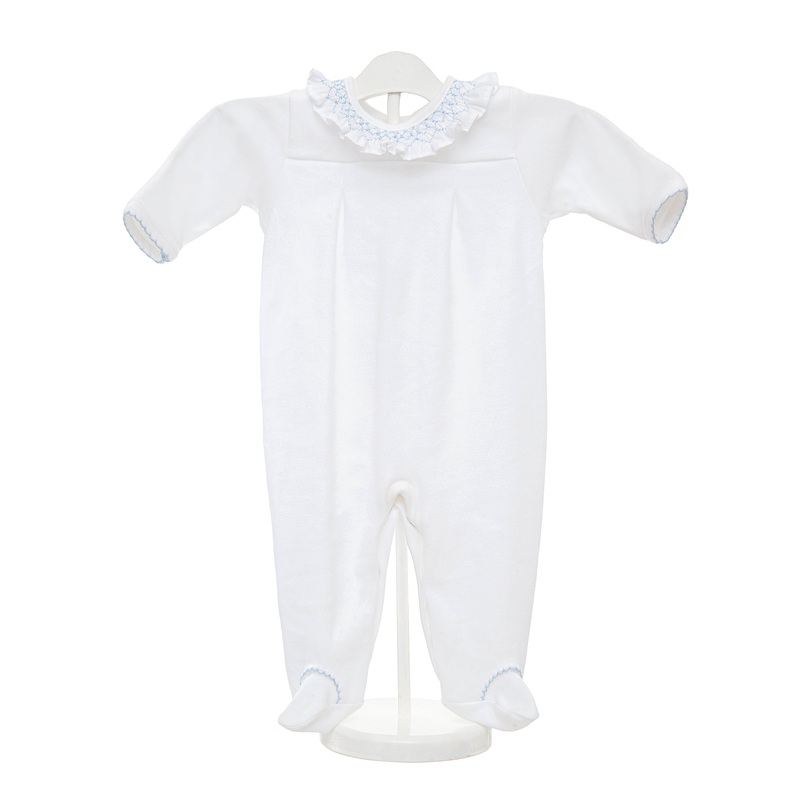 Made with a dreamy Pima Cotton Knit. Gets softer and cozier with every wash. Features a delicate, hand-smocked ruffle collar. Contrast stitching along the sleeves and feet. Vintage vibes with an old-fashioned look. Built-in mittens for added warmth. Runs t