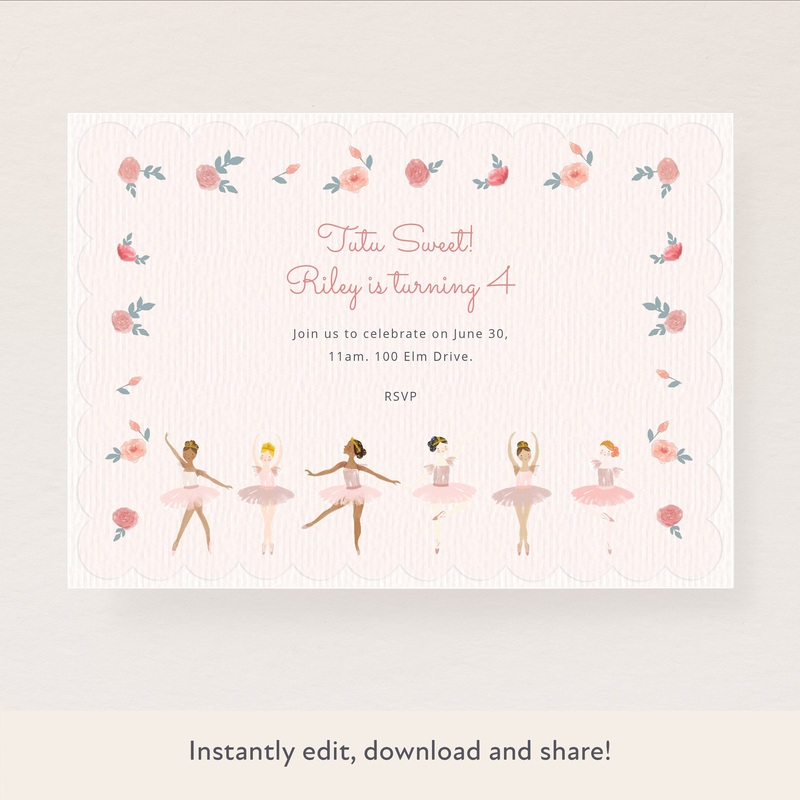 The beautiful ballerinas are poised and ready to party! They really do make the most perfect design for an invitation to a ballet birthday party. All you need to do is add in the child's name and age, and the date, time and party address, to personalize an