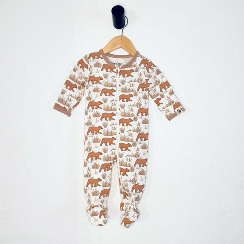 Bear Print Footie on Cream Ground Light Brown Contrast Trim for a Stylish Look Perfect Gender Neutral Print Super Soft Custom Fabric Blend of Organic Cotton, Recycled Polyester, and Spandex Brushed for Added Softness True to Size with Size Chart Reference
