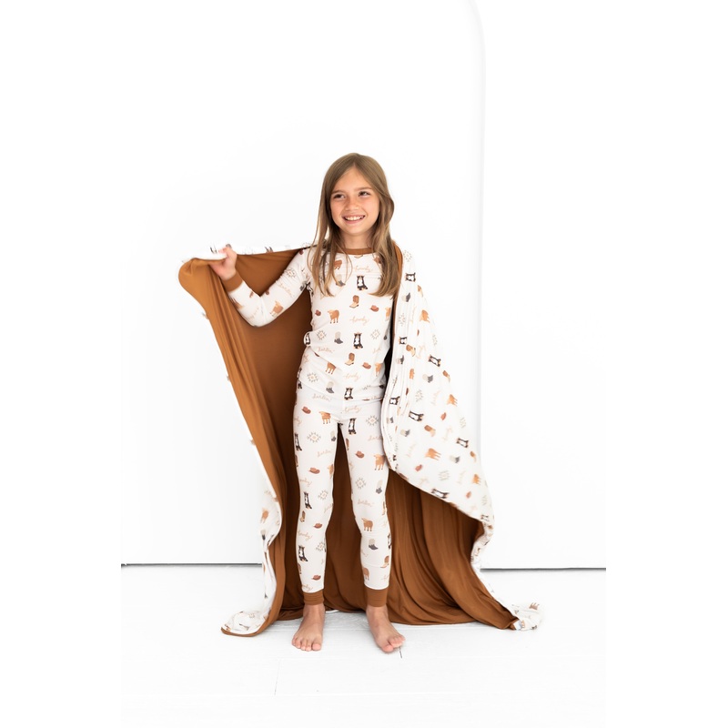 Triple-layered bamboo viscose blanket that gives a slightly weighted feel. Temperature regulating fabric to keep your littles cozy year-round. Liberally sized at 50" x 50" for maximum huggability. Features one side with a printed design, and a color coordi