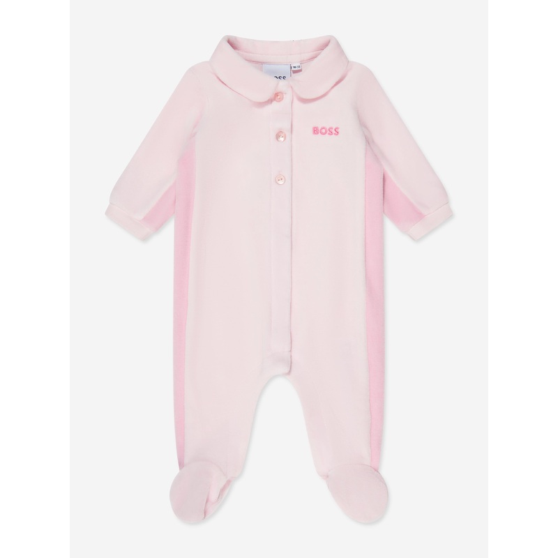 Introducing the exquisite Baby Girls Velour Babygrow in Pink by Boss – a sheer indulgence of style and comfort for your baby girl. Key features put in short, meaningful bullet points to further illustrate the product’s appeal are: