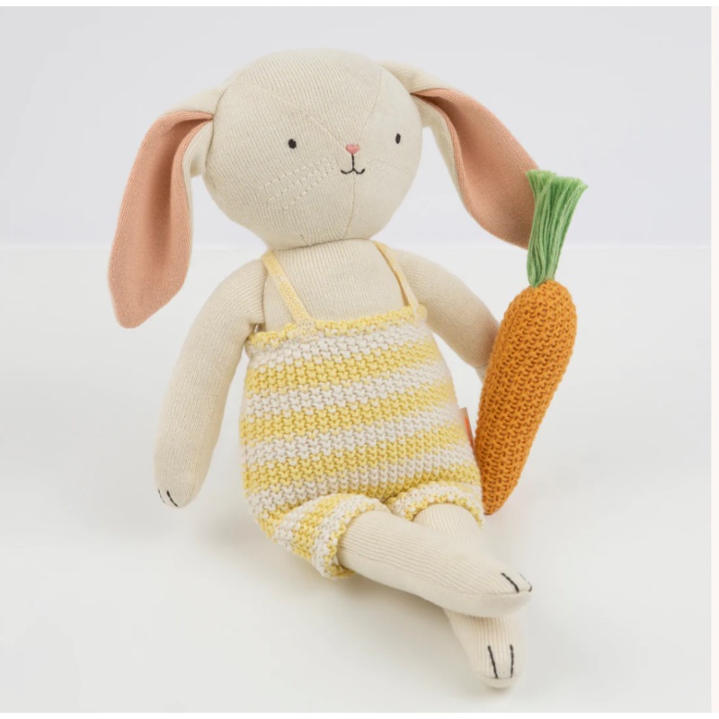 Meet Honey the bunny, a quality knitted toy crafted from soft organic cotton. Honey is dressed in an adorable crochet romper and is clutching a crochet carrot. A fabulous Easter gift or toy for imaginative play, it's the perfect little friend for children