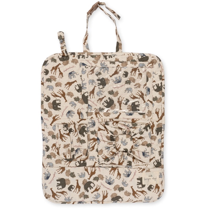 Car organizer made in 100% organic cotton with recycled polyester filling. The organizer is portable and easy to carry designed with adjustable straps that attach to the car headrest and car seat. Features a compartment for a tablet and various sized pockets, one designed especially for wet wipes, making storing and organizing essentials simple. The organizer also features an elasticized strap with velcro closure to hang an activity toy or pacifier case.