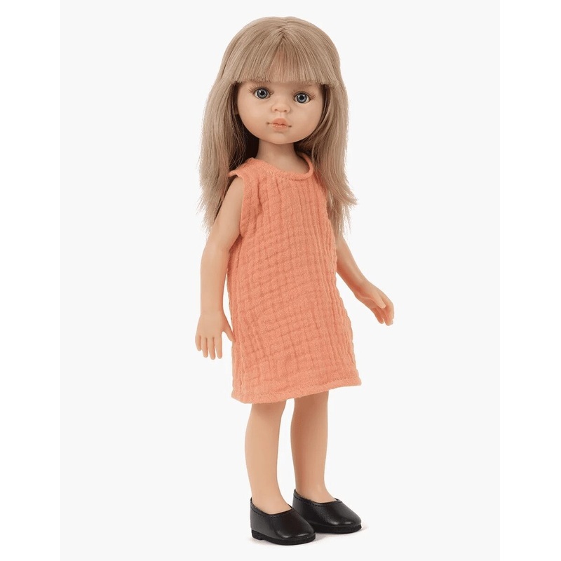 Carla Amigas Doll with Blonde Hair 32cm phthalate-free vinyl body, hair with fringe, fixed eyes with painted lashes and eyebrows. The doll comes with panties, a double gauze sleeveless cotton dress (colors may vary) and little black shoes.