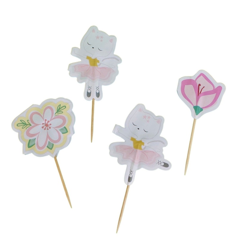 Featuring pink and yellow flowers and cat ballerinas in two different positions. These cake toppers are graceful and ludic. It's a must add to your cake party table! Designed by Pooka Party. Package contains 12 toppers. Not safe for microwave use.