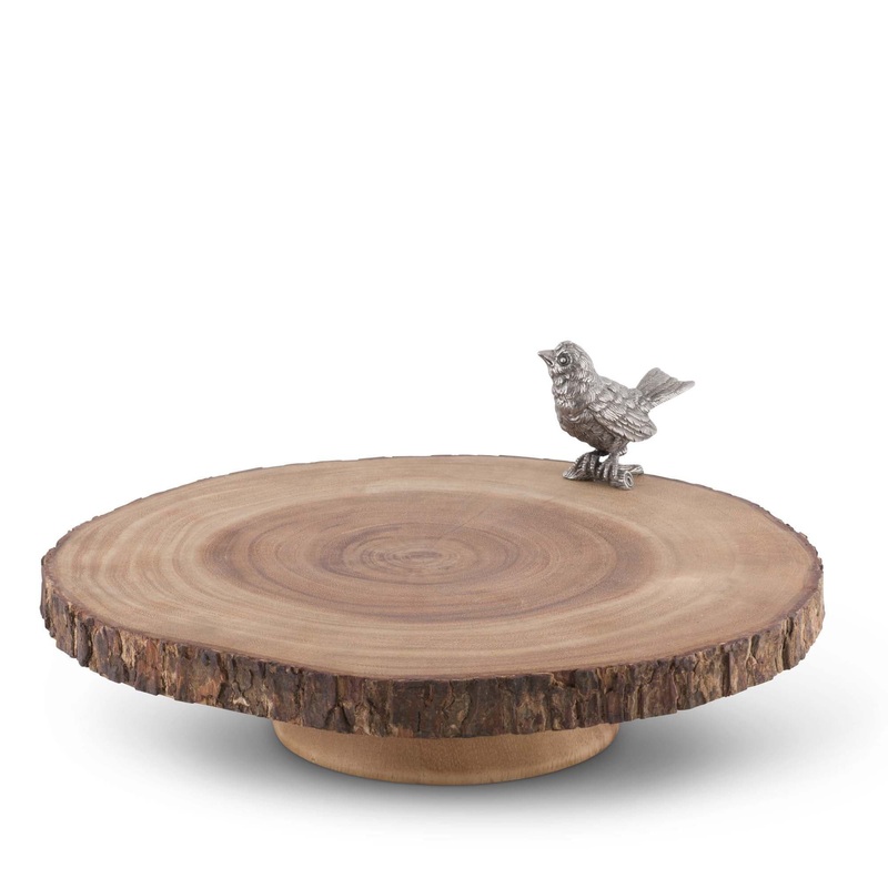 Unique, sweet and rustically charming, this stand brings a touch of natural whimsy to your table. Crafted from slab cut acacia logs, the natural wood stand has a 1.5 inch riser foot below. A mini Song Bird statue in luxury pewter perches on the stand, so realistically detailed, your guests might worry he will peck their fingers!