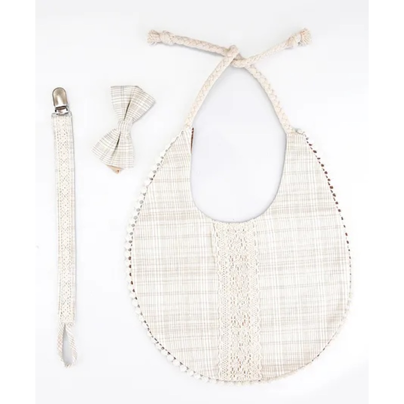 Choko Baby Bib Set with Adjustable Soft Dori, Matching Headband and Pacifier Clip Holder – Off White
