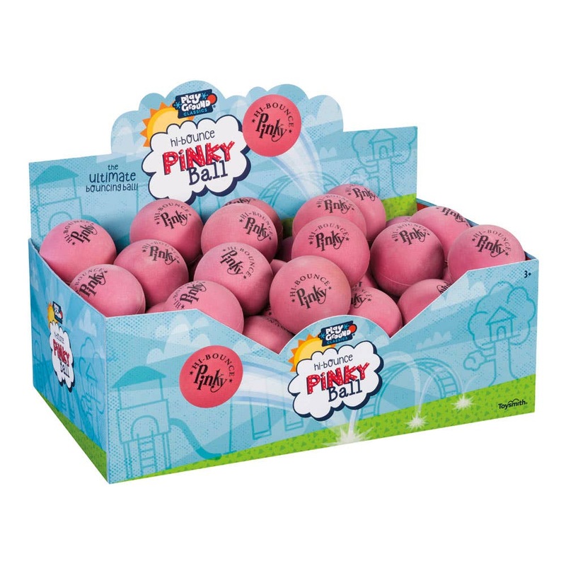 Measuring 2.5 inches in diameter, this beloved classic childhood toy is a best seller in stores and for larger organizations like schools and kids activity groups. Each pink bouncy ball is made with high-quality solid latex rubber material thats soft and spongy and super bouncy. Suitable for indoor or outdoor use. An illustrated 9.76 x 7.36-inch display case featuring a blue sky and green grassy bottom, a flying pink ball, and the Playground Classics branding is available. Age Grade: 3+ Product Dimensions/Weight: 1.8 L x 1.8 W x 1.8 H / 0.2 lb Inner Pack Dimensions/Weight: 14.2 L x 7.9 W x 5.6 H / 7.0 lb Made In: China Batteries not required