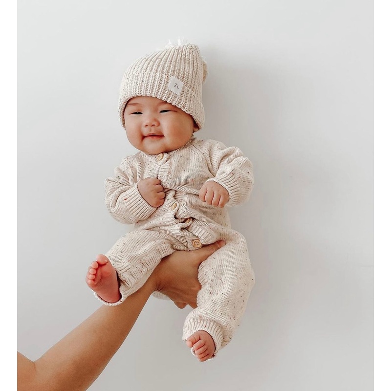 A beautifulknittedromper, designed with comfortin mind. Designed to be a timeless keepsake to remember just how teeny, tiny they were. A highquality pieceto pass down to other siblings or aspecial something to pop in their keepsake box. Pair with our matching beanies & bootiesforthe perfect winter outfit. Functional snaps at crotch for easy nappy changes.