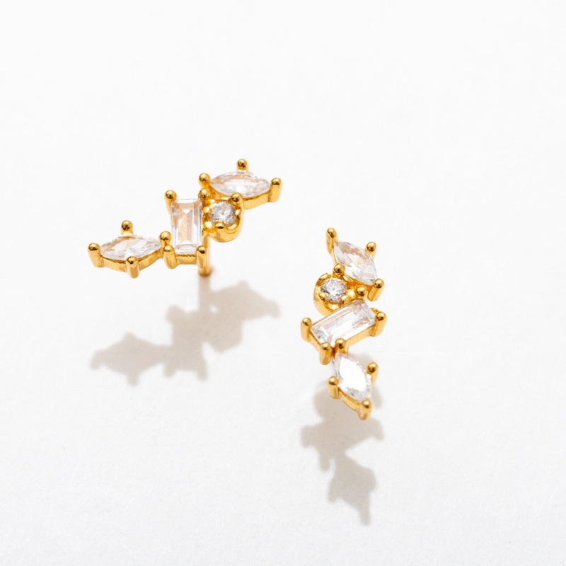Whimsical star cluster for your lobe. Real zircon gemstones. 18k gold plating on sterling silver base. 18k gold plated butterfly ear nut. Nickel-free and naturally hypoallergenic. Measures 13 mm x 4 mm.