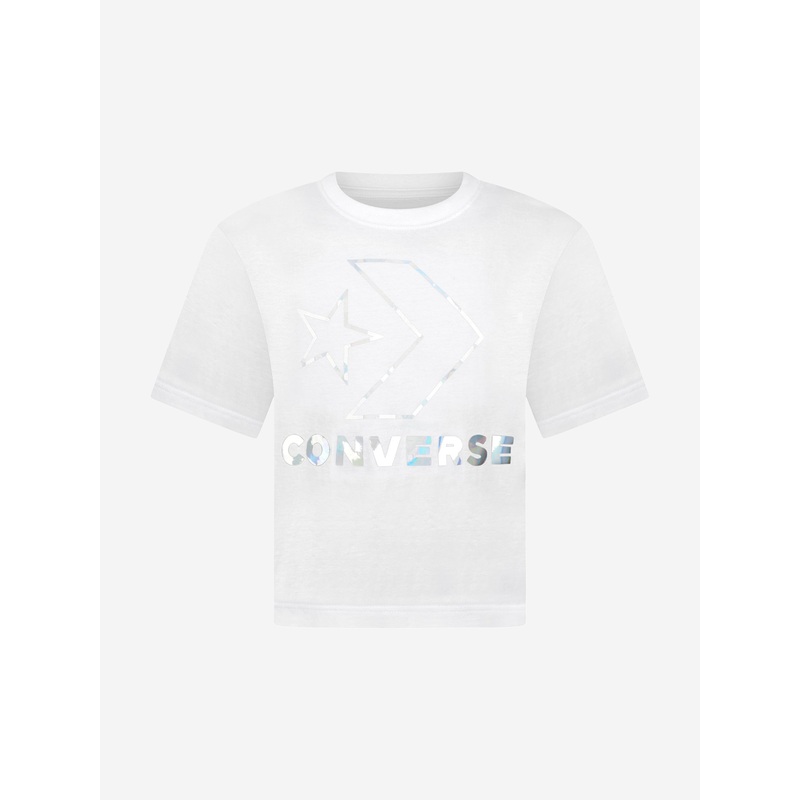 Introducing the Girls Star Chevron Iridescent Boxy Top in White colour by Converse. A luxurious addition for your girl's wardrobe, combining style and comfort perfectly. Key features: Trendy Print: Adds a playful and stylish twist with its captivating prin