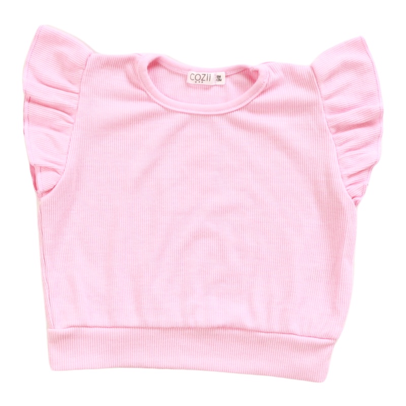 Charming blend of style and comfort. Features sweet ruffle sleeves. Made with 2X1 P/R SPANDEX material.