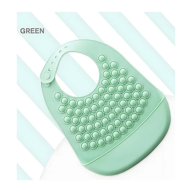 Sensory Pop-It Fidget Toy Keeps babies engaged and helps develop fine motor skills through popping fun.Adjustable Neck Strap Customizable fit for newborns and toddlers alike.Large Built-In Pocket Deep pocket captures falling food and liquids to keep clothe