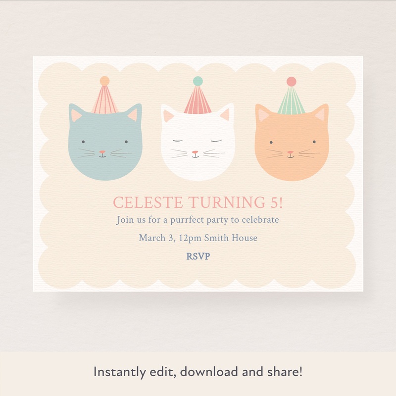 Throw the purrfect Party with these adorable cat-themed invitations that work for feline-filled birthdays and even fun parties for your beloved kitty. Miaow-vellous! Simply add the details of your celebration, including the name, date, time and party addre