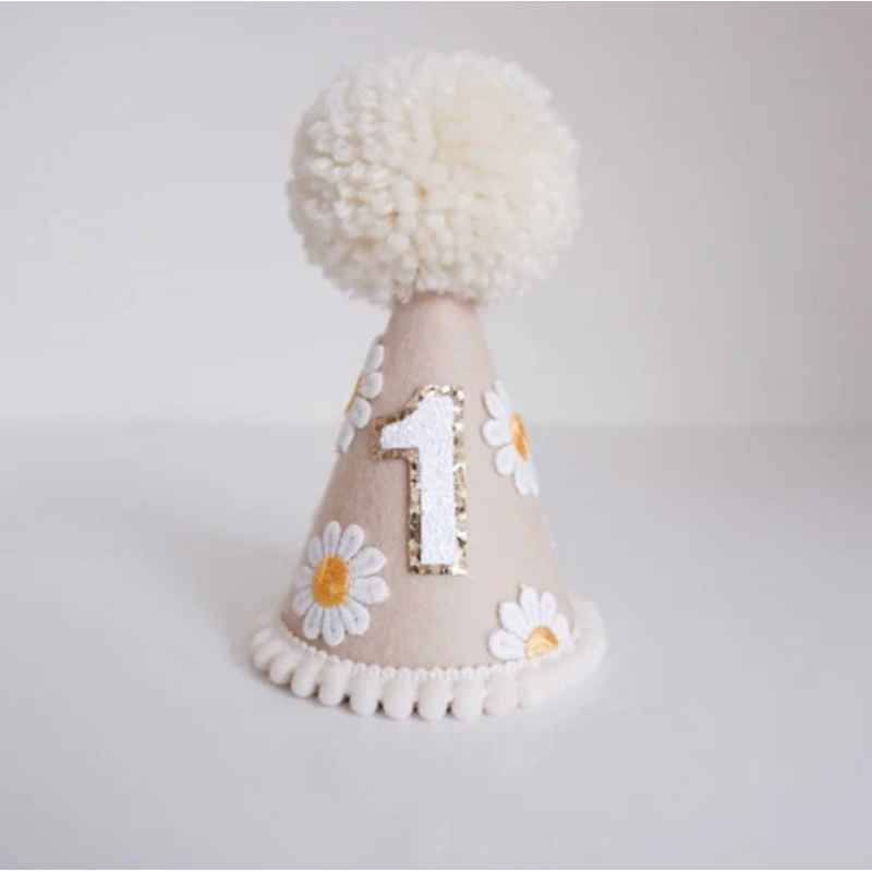 Our Original Daisy Boho Party Hat,so perfectfor any daisy or boho themed cake smash, birthday photoshoot or birthday event!COLOURSNatural Beige hat, with feature daisiesNatural beigemini pom trimNatural beigehandmade pom pomwhite glitter number, withgold g