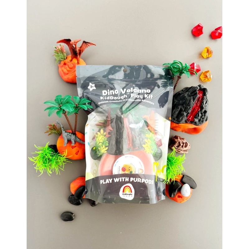 This Dino Volcano play kit is a prehistoric park full of sensory play fun!Includes 8 oz Red/Orange Marbled (Cherry Mango) KidDough , 2 Dinos, a Volcano Prehistoric Plants, Palm Trees, Rocks and Lava AcrylicsOur super silky sensory doughs are buildable like