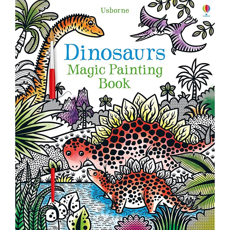 Brush water over the black and white illustrations and watch the prehistoric scenes burst into color! There are velociraptors hunting for food, pterodactyls flying high in the sky, baby dinosaurs being born, and much more. The back cover folds out so you can place it between the pages and prevent colors from running onto the page beneath.