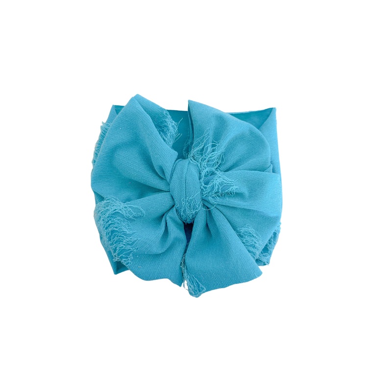 Bring breezy vibes to your babys wardrobe with a Pacific Blue distressed headwrap. Features a soft, stretchy band for all-day comfort. Hand-tied bow measures 6 inches across. Combines comfort with ocean-inspired charm. Lovingly made by Texas moms. Perfect