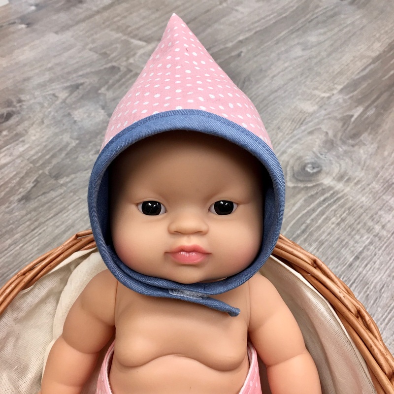 Fully reversible cotton woven pixie bonnet for 13" dolls with cotton lining and velcro closure. Reversible light denim on one side and pink polka dot cotton on the other. Perfect for our Minikane Gordis Collection or any 13" doll. Matching doll diaper sold