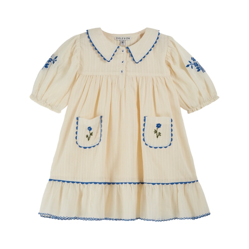 Dress in ecru Dobby cotton with matte and shiny stripes. You’ll appreciate the quality and finesse of the soft fabric, as well as the ample shape provided by the gathers. The balloon sleeves are elasticated with a ruffled effect at the bottom, and the flat collar is embellished with a dark pink croquet braid. Hand-embroidered pink flowers and English seams extend the life of this fully lined dress. Dobby weaving, named after the loom on which it’s produced, allows you to create patterns, color effects and add texture like honeycomb, embossed, quilted.