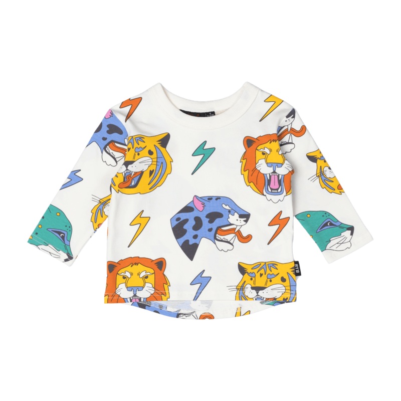 Introducing our Electric Baby T-Shirt!Made from 95% cotton and 5% elastane jersey, this t-shirt features a grey marle bodice with a print of lion, with mustard long sleeves and musrard ribbing across the neck and sleeves.