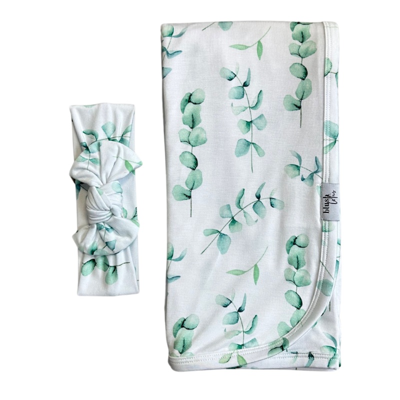 Soft as a cloud, Cozy as a cuddle. Brand: Blush Lotus Includes Swaddle + Headband or Swaddle + Top-knot Hat Material: 95% Viscose from Bamboo, 5% Spandex One layer Dimensions: 44" x 44"