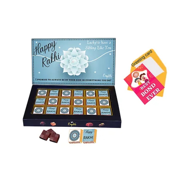 Premium 18 piece assorted flavor chocolates with raksha bandhan themeChocolate Flavors Roasted dry fruit Filling, Cranberry filling, pan filling, butterscotch filling, mix fruits filling, Choco chip filling.Real products are same as they look in pictures.H