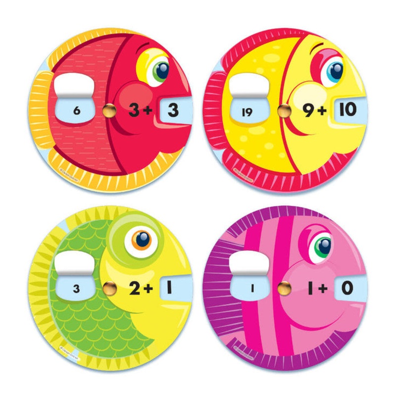 Help students practice addition facts by using fun curriculum cut-outs.Foster the home-to-school connection and provide fun ways to practice addition facts with these fun math wheels. The EZ-Spin: Addition Facts curriculum cut-outs set includes 18 two-piec