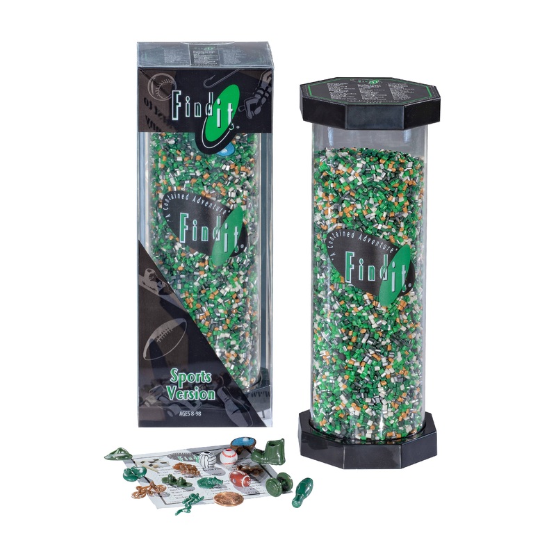 The Find It SPORTS version contains colored pellets simulating an outdoor sports playing field. The game is secured by black caps and includes 40+ hidden objects. The hidden items include a jet ski, boxing gloves, basketball hoop, tennis racket, football and the elusive US penny. The packaging is sure to intrigue sports enthusiast. The hidden objects are itemized on the top cap with a check off pad included with the game. All Find It games are assembled in the USA.