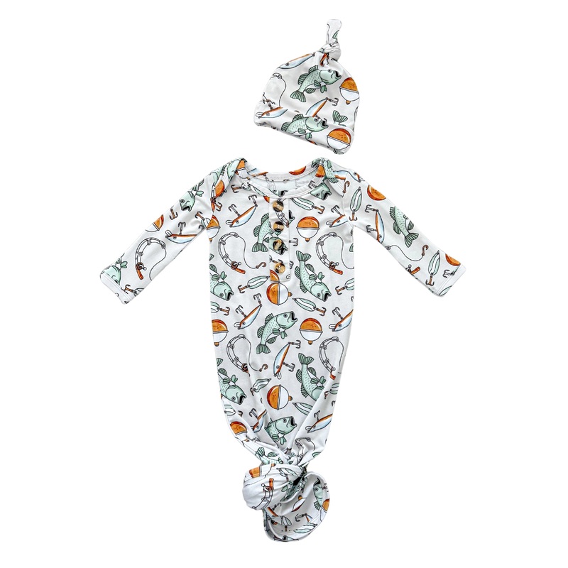 Made from soft, breathable bamboo fabric for ultimate comfort. Features an adorable fish print for a whimsical touch. Adjustable knotted gown ensures easy diaper changes. Matching hat adds a sweet finishing touch. Heat-stamped branding for comfort (no itch