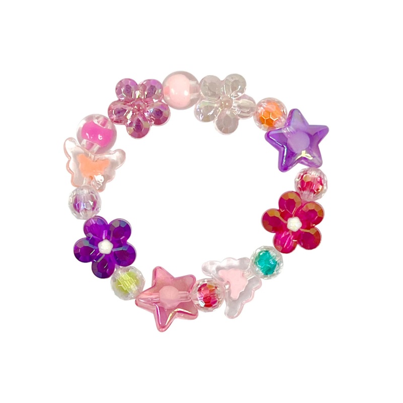 Pink Poppy’s flower bracelet is a stylish accessory that infuses a delightful touch of whimsy. Crafted with a rainbow spectrum of candy-coloured beads in charming floral, star and butterfly designs, the bracelet radiates an iridescent shimmer.