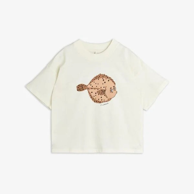 Off white T-shirt with big Flundra print in front. Made from 100 % GOTS-Certified organic cotton. Designed in a loose fit with dropped shoulders. Flundra print Ribbed collar Dropped shouldersMaterial 100 % Organic Cotton GOTS certifiedThis garment is produ