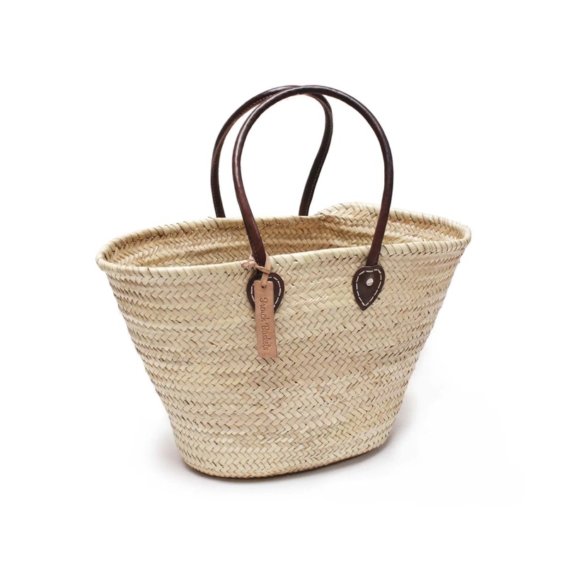 Handwoven from sustainable palm leaves Straw palm leaf ||| genuine vegetable tanned leatherEco friendly ||| 100% biodegradable Ethically handmade in MoroccoMade in Morocco21" wide x 13" tall without handle, 23" with handledimensions are approximate and may