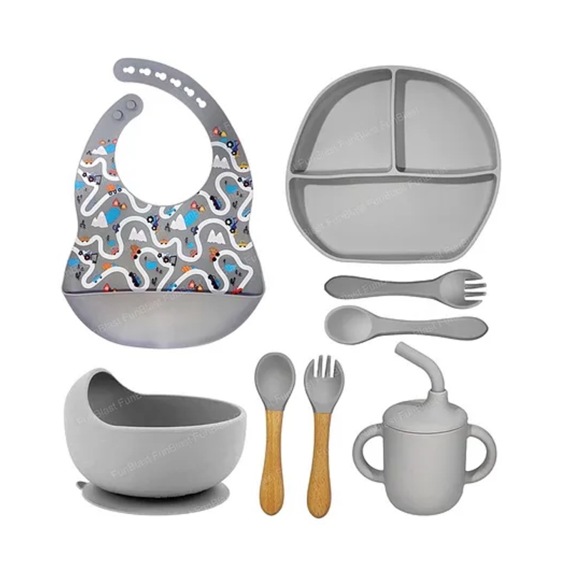 OCAL33215261223FunBlast Silicone Baby Tableware Feeding Set 8 Pcs Grey