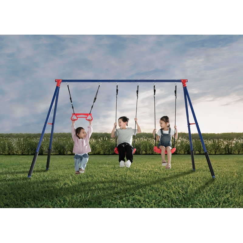 Take playtime to new heights with the FunZone Outdoor Metal 3-Piece Swing Set by Delta Children! Kids can soar on two swing seats or a trapeze bar with gym rings, enjoying endless outdoor fun that helps reduce stress and anxiety, improves mood, boosts creativity and imagination, and enhances attention span and focus. And thats not all, this swing set will help promote gross motor skill development by pumping legs, running and jumping, and fine motor skill development with grip strength, hand, arm and finger coordination. The rope attachments are adjustable to ensure a perfect fit for all ages and heights. Built from premium, child-safe materials, this A-frame swing set includes all hardware and ground stakesno extra purchases needed! The two-inch heavy duty, weather-resistant frame is powder-coated to prevent corrosion, rust and weathering, while the legs include foam padding for added safety, and the molded plastic swings and rope attachments are resistant to weather conditions such as rain and UV rays. Each element supports up to 100 pounds (300 pounds total), making it the perfect addition to any backyard!