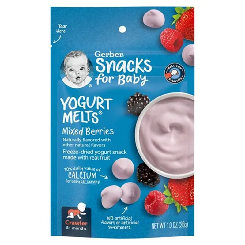 As your baby grows into toddlerhood, about 25% of his calories will come from snacks. Gerber YOGURT MELTS snacks are a great way to make every bite count by providing vitamins A, C & E for healthy growth and natural immune support. Gerber YOGURT MELTS snacks are freeze-dried yogurt & fruit snacks and are naturally flavored with other natural flavors. Feeding, preparing, and storing this product should only be fed to seated, supervised children who are accustomed to chewing solid foods and reseal after use or maximum freshness use within 7 days of opening.