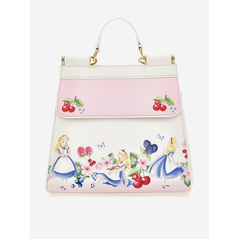 Monnalisa's dreamy Avant-Garde aesthetics are both charming and divine. This girls handbag is woven from beautiful cruelty-free leather. Inspired by Disney's Alice in Wonderland imagery. Features a top handle showcasing an upper hinged door with a magnetic