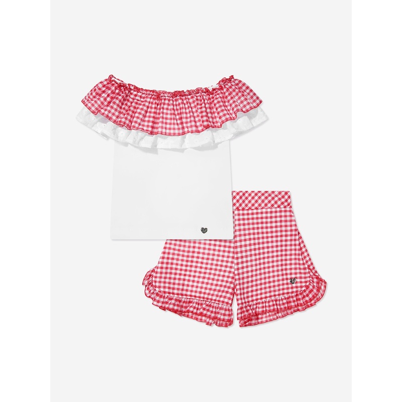 Introducing the exquisite Girls Gingham Shorts Set in Red by Monnalisa, an Italian creation perfect for SS2025. This chic ensemble promises to be a captivating addition to any young girl's wardrobe. Its features include: Italian Craftsmanship: Exquisitely