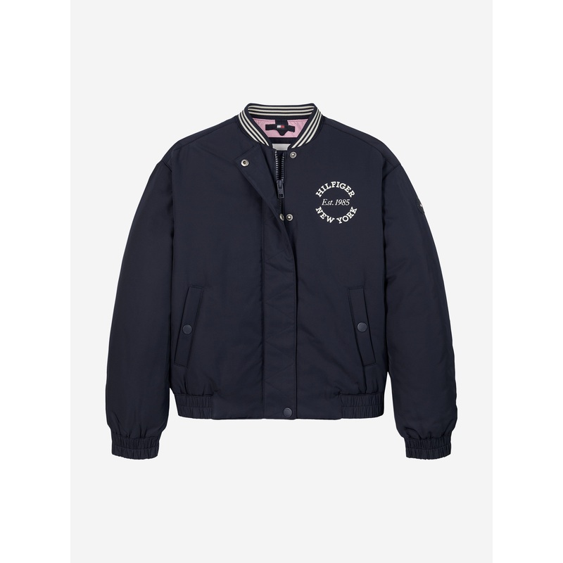 Elevate her style with the Tommy Hilfiger Girls Varsity Sateen Bomber Jacket in Navy, a sophisticated addition for SS2025.