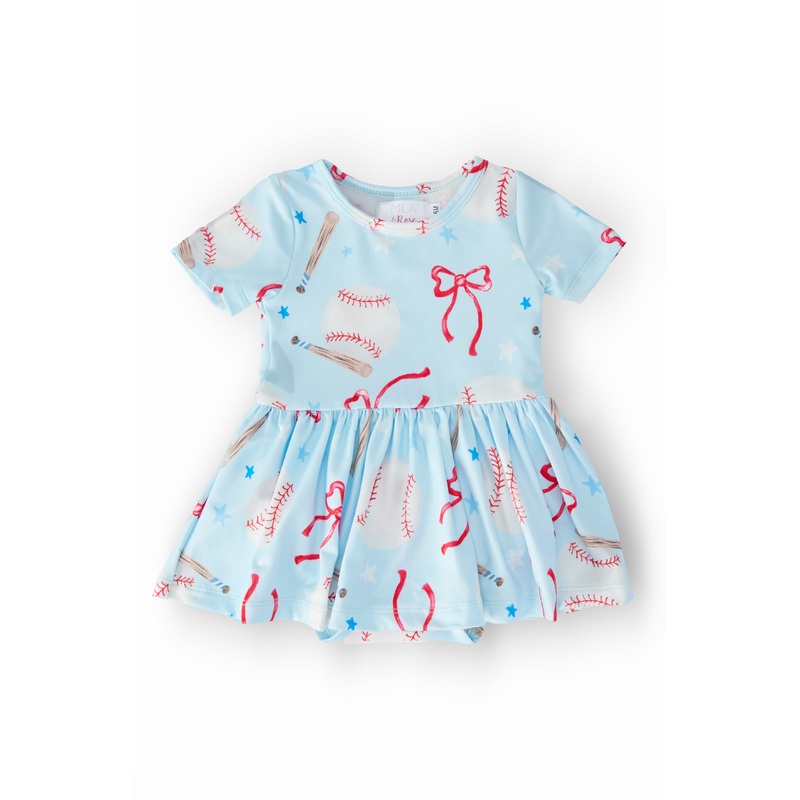 Newest addition to the twirl line. Perfect for babies! Snap closure for diaper changes. No need for bloomers. Mix and match with the Baseball collection for siblings or friends. Instructions: Wear, twirl, repeat. True to size. Fabric: Polyester/Spandex. Ca