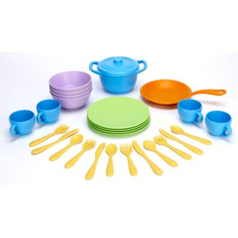 Young chefs can concoct and serve make believe culinary treats that have real benefits for the earth with the world greenest cookware set. Like all Green Toys products, the Cookware & Dining Set is made from advanced environmentally friendly materials, helping to reduce fossil fuel use and CO2 emission, all in the name of Good Green FunTM! Dishwasher safe. Set includes: Stock Pot with Lid, Skillet, 4 place settings (Fork, Knife, Spoon), 4 Plates, 4 Bowls, 4 Cups.