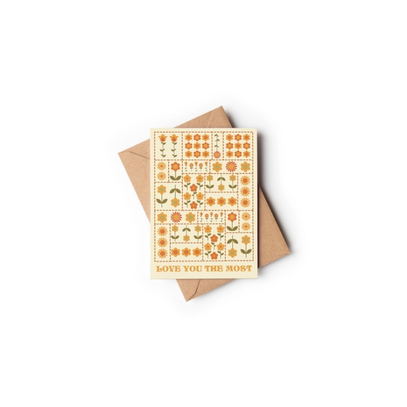 Love You The Most Greeting card. Vintage inspired illustration of orange and yellow flowers in various shapes and sizes in a patchwork style layout with Love You the Most across the bottom in a mustard yellow. A versatile card that can be used for many occ